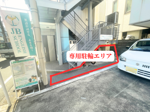 入り口の階段下、横に専用駐輪場エリアがありますので、自転車での通学も便利!